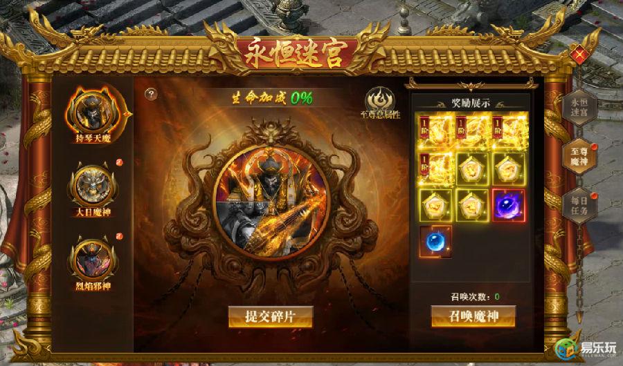 魔神共3个,每个魔神具用6个基础部位,提交对应部位碎片可提升部位等级,每6个部位等级+1可召唤魔神,击杀魔神可获得大量极品奖励(每个魔神每日上限20次)。