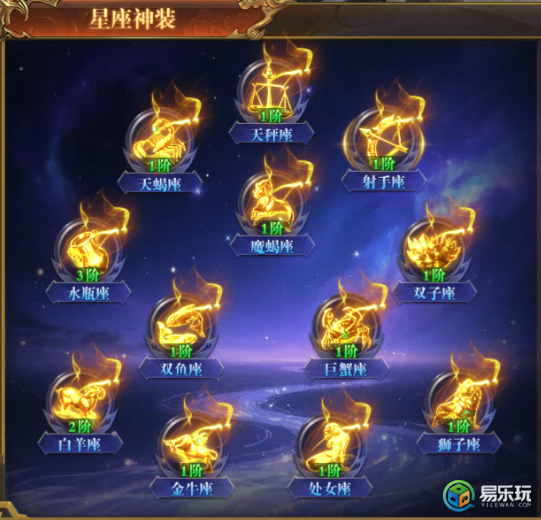 收集星座神装可获得大量稀有属性,集齐全套十二星座神装还可激活强力技能--十二宫守护:
