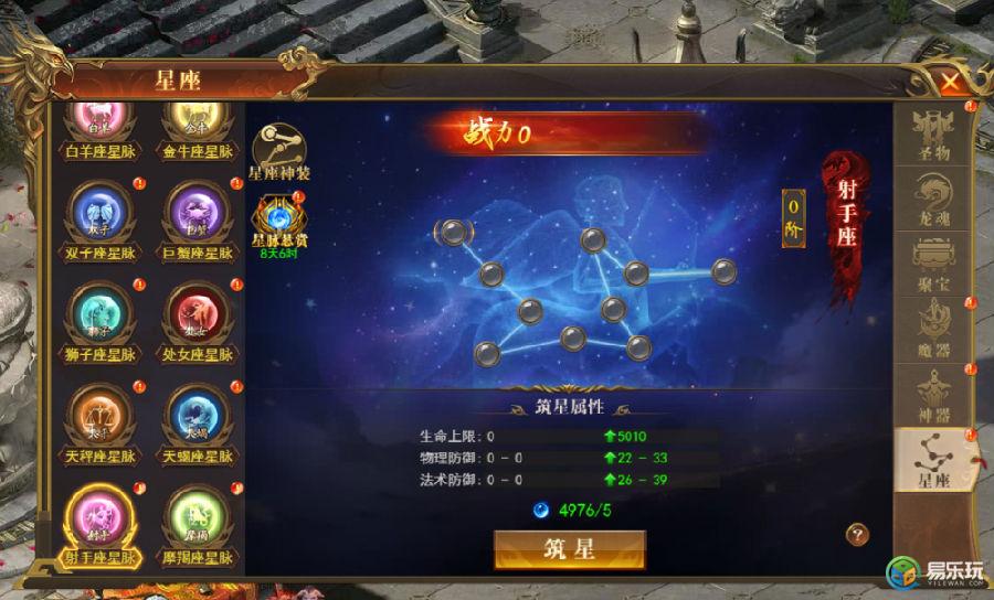 消耗星脉精华(永恒迷宫,击杀至尊魔神等途径可获取)为十二星座筑星可获得大量基础属性,提升十二星座等阶还可解锁对应星座神装穿戴和升阶条件。