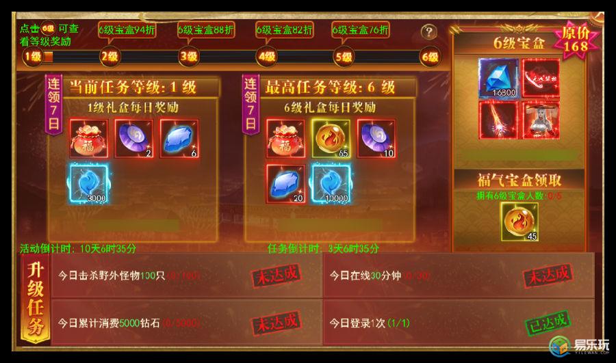 任务阶段达标每日目标升级宝盒,奖励阶段每日领取宝盒奖励,最高可免费升至5级宝盒,直购6级宝盒可领时装大礼!
